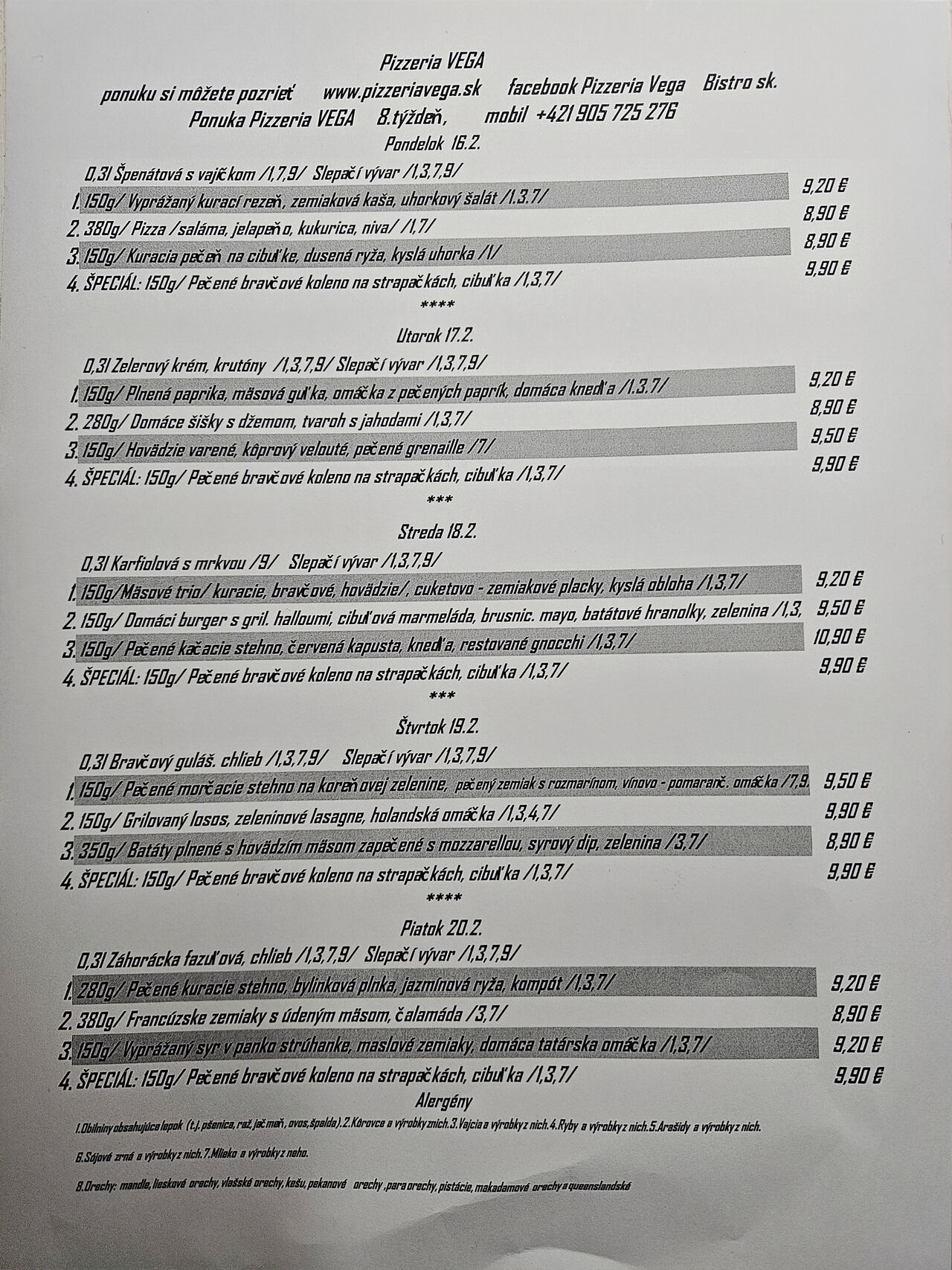 Ochutnajte naše jedlá, ktoré sú pripravované vždy z čerstvých a kvalitných surovín od overených dodávateľov na trhu. V jedálnom lístku nájdete mäsité aj bezmäsité jedlá, grilované špeciality, cestoviny, čerstvé šaláty, domáce polievky a chutné dezerty. Denné menu sa u nás podáva od pondelka do nedele od 11:00 do 14:00.V našej pizzerii ponúkame aj miešané alkoholické a nealkoholické nápoje.